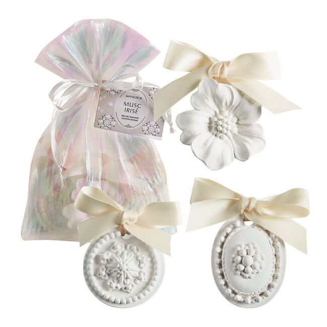 Dit elegante zakje bevat drie met de hand afgewerkte geurdecoraties in fijn gips. Elk stukje is met zorg vervaardigd en verspreidt een subtiele, langdurige geur in kleine ruimtes zoals kleerkasten, lades of koffers.