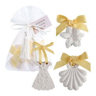 Dit elegante zakje bevat drie met de hand afgewerkte geurdecoraties in fijn gips. Elk stukje is met zorg vervaardigd en verspreidt een subtiele, langdurige geur in kleine ruimtes zoals kleerkasten, lades of koffers.