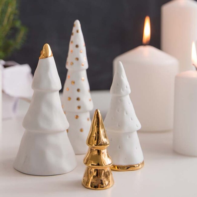 Deze set van vier porseleinen boompjes is een fantastische manier om je huis wat extra kerstglam te geven. Elk boompje is met de hand geverfd en heeft een eigen uniek formaat. Met een maximale hoogte van 15,2 cm kun je ze op een dressoir of bijzettafel zetten en zo je eigen magische kerstbos maken. Het matte porselein en glanzende goud maken deze decoratiestukken onweerstaanbaar.